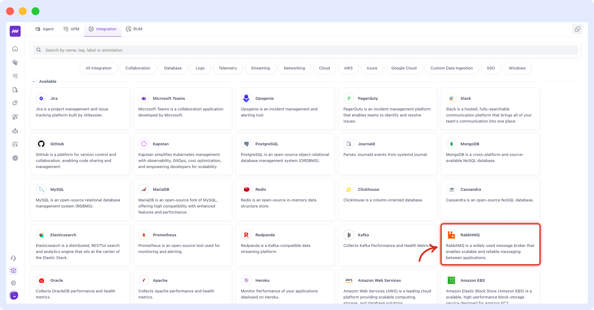 The RabbitMQ Integration enables real-time visibility into your message broker performance. Monitor your queues, exchanges, channels, and nodes by creating custom visualizations to track the metrics that matter most to your system.